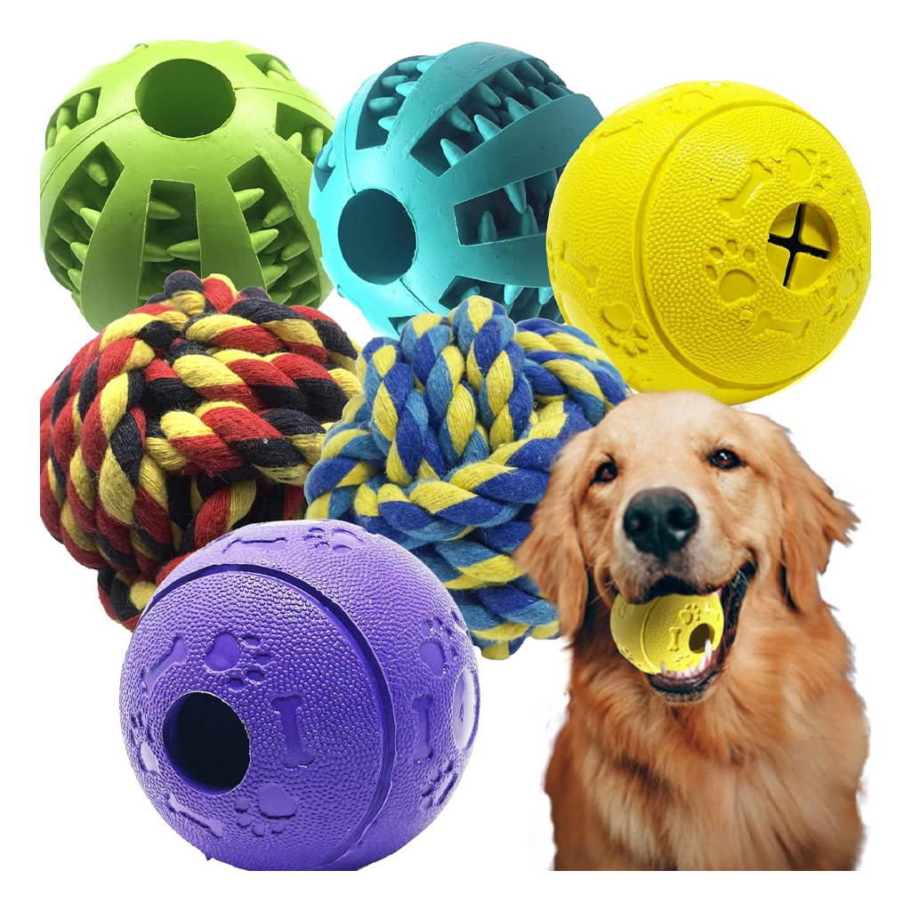 Includes six TPR rubber toys in vibrant colors and varied shapes. Waterproof, fun to toss, and great for dental cleaning. Spiked texture helps massage gums while dogs chew. Use them to teach commands and play games.